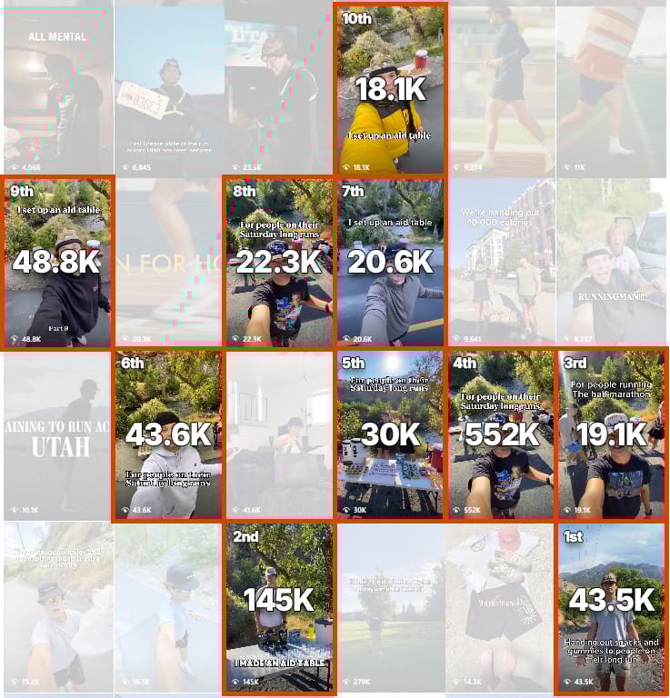 Adam's viral content averages 1.45 million views per post, based on a sample of 14 posts. His aid station videos average 110K views, based on 12 posts.